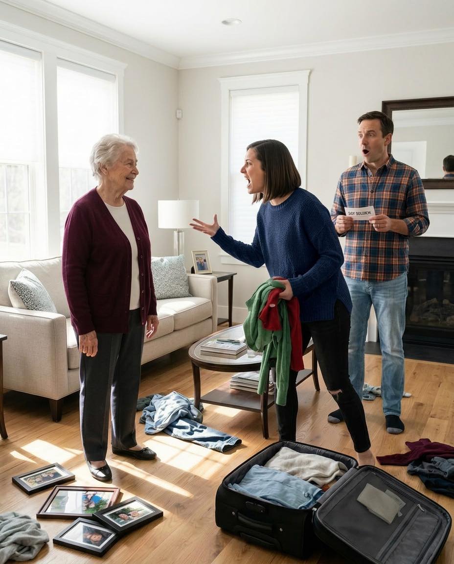 That evening, while Daniel was outside taking another call, Elise marched into my room, yanked open my closet, and started tossing my sweaters, shoes, framed photos, and medication into two worn suitcases. “Get out,” she snapped. “We have a new life now, and you are not part of it.”