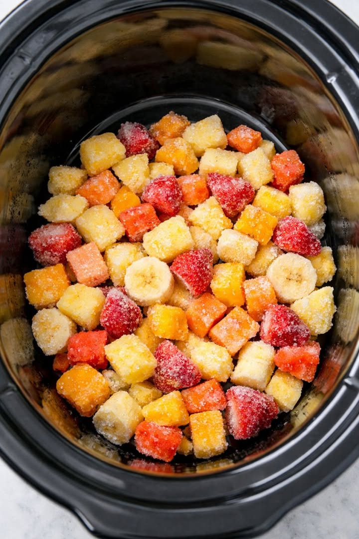 Slow cooker filled with frozen tropical fruit on a kitchen counter